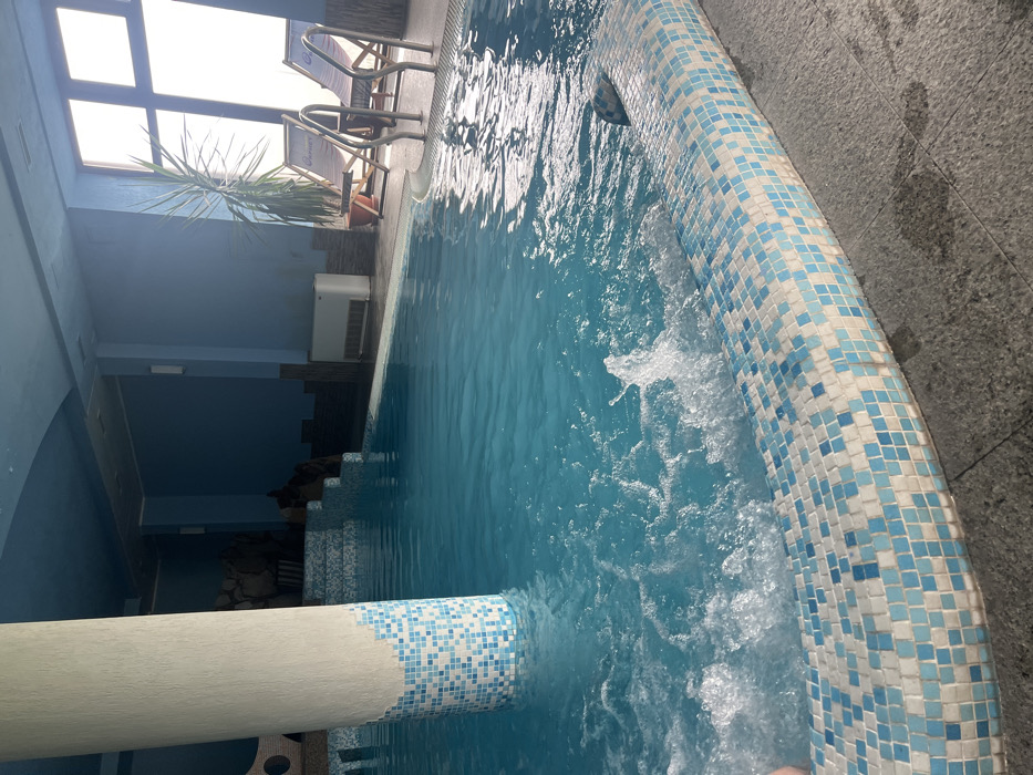 This image depicts an indoor swimming pool and jacuzzi facility located in Bansko, Bulgaria. The foreground shows a section of the pool with clear blue water vigorously bubbling, indicating a hydro-massage feature. The pool's rim and a large, central support column partially submerged in the water are adorned with a mosaic of light blue and white tiles. The room's walls and arched ceiling are uniformly painted light blue. On the right, a large window unit allows bright natural light into the area. Situated beside the window are two light-colored sun loungers with wooden frames, one partially obscured by a metal pool ladder. A tall, potted green plant stands between the window and the lounging area. A white, floor-level heating or ventilation unit is mounted on the wall near the window. In the background, a multi-tiered, rock-like decorative structure with steps is visible. The floor surrounding the pool is composed of dark grey textured tiles. A small portion of a submerged limb is visible in the bottom-left corner of the bubbling water.