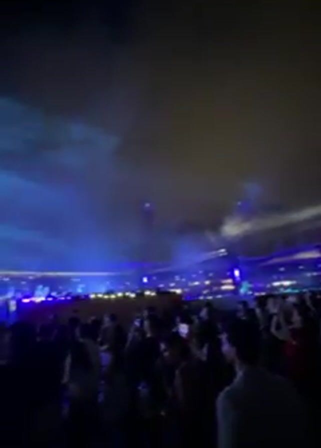 A large crowd of people is gathered at night for an outdoor event, likely a concert or festival. Above the crowd, bright blue lasers cut through the air, creating an atmosphere of excitement. A large screen displays a video of a man wearing sunglasses and a colorful hat, who seems to be performing or DJing, adding to the lively vibe. The people in the crowd are moving and appear to be enjoying the show. The night sky is visible overhead, enhancing the sense of being at a large-scale outdoor event.