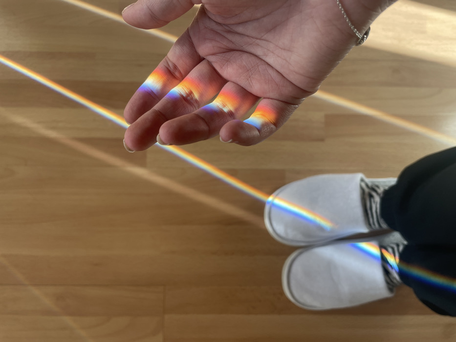 The scene depicts an indoor environment with a light-colored wooden floor, where multiple linear strips of rainbow-spectrum light are cast