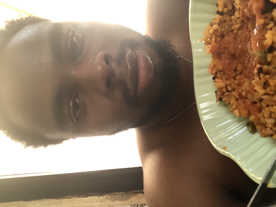 The image depicts a dark-skinned adult male in Karu, Nigeria, shirtless, with short dark hair and a beard, looking directly at the camera. A thin silver chain is visible around his neck. His face appears moist, suggesting perspiration. He holds a light green, ribbed bowl containing a rice dish, characterized by orange-tinted rice, a prominent red sauce layer on top, green peas, and dark particulate matter. A metallic utensil extends into the bowl from the lower left. The background features an intense, overexposed light source on the right, contrasted by a darker, textured vertical surface on the left. The scene is set indoors.