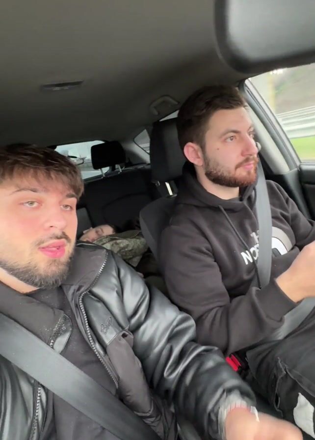 The video depicts three young men inside a car. The camera is hand-held, facing forward from the passenger seat. The man in the passenger seat wears a black leather jacket. He looks at the camera and speaks, though the audio is unintelligible. The driver, to the right, is looking forward, wearing a black hoodie and scrolling on his phone. In the back seat, a third man is lying down, seemingly asleep and covered with a green jacket. The interior of the car is visible, with seats, seatbelts, and a dashboard. The car appears to be in motion on a highway, with glimpses of roadside barriers and trees visible through the windows.