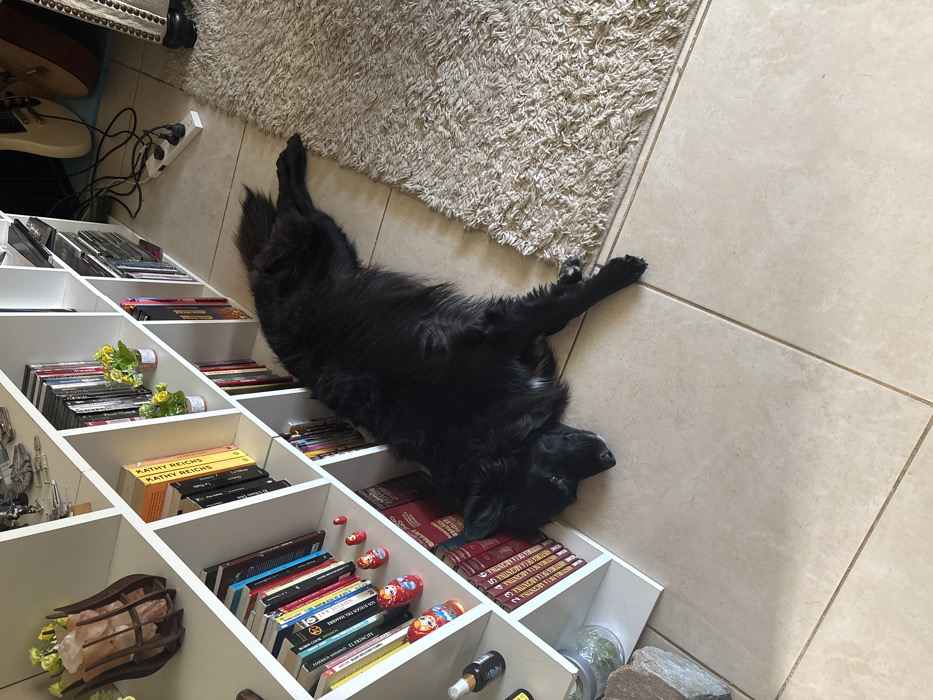 A large, black dog is splayed out between a white shelving unit and a beige rug. The dog lies on its back, its body draped over the books and items on the shelves, and its legs stretched out on the tiled floor. The shelves contain books, CDs, and decorative objects. Guitars and other objects appear in the background to the left. The scene is captured from a slightly elevated angle.