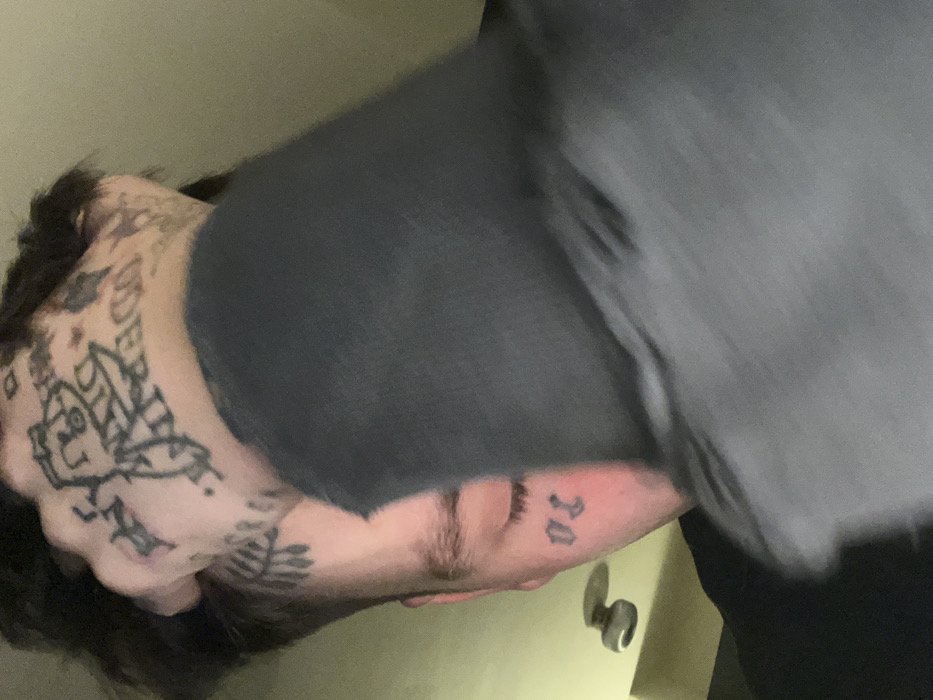 A male individual is depicted in a close-up, upward-angled shot within an interior setting in the city of Orsay, France. The subject's right hand, heavily adorned with black ink tattoos featuring various letters and symbols (including visible elements resembling "ODEON" and "DIVA"), is positioned in his dark hair, fingers interwoven, suggesting an action of touching or adjusting his hair. The person's right eye is partially visible and appears closed or squinting, while a tattoo displaying "02" or "OZ" is present on his right cheekbone. Another tattoo, resembling a leafy or branch-like design, is visible on his right temple/forehead. A dark, possibly grey, sleeve covers a significant portion of the left side of the image, partially obscuring the subject's face and body. The background consists of a uniformly light-colored wall, possibly beige or light yellow, with a small, circular, metallic fixture visible in the lower-left corner. The scene is illuminated by indirect lighting.
