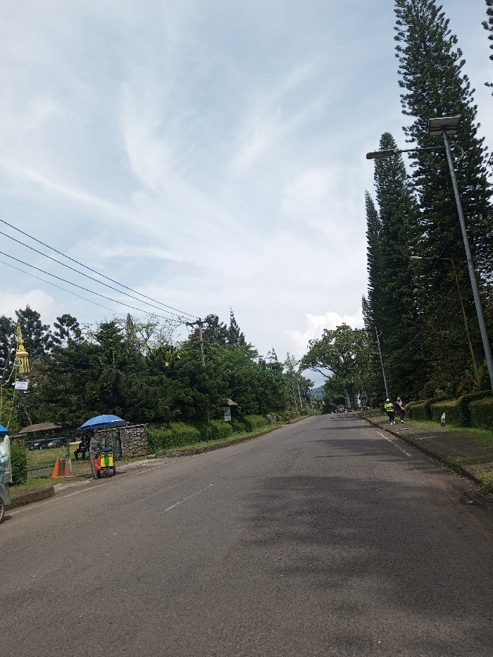The image displays an asphalt road extending into the distance under a partly cloudy sky in the city of Namthoung, Laos. On the left side of the road, a street vendor's cart, colored yellow and green, is positioned beneath a blue umbrella. An individual stands near the cart. Two orange traffic cones are visible on the ground. Behind this area, a green metal fence and a stone wall separate the road from dense green foliage. A golden, decorative spire-like object is visible above the tree line. Utility poles with multiple power lines traverse the upper left portion of the frame. On the right side of the road, several tall, slender coniferous trees line the edge, accompanied by a streetlight featuring a solar panel. Further down the road on the right, two individuals are walking on a paved pathway or sidewalk, moving away from the viewer; one person wears a light-colored, possibly reflective vest. The background reveals distant hills or mountains partially obscured by haze and vegetation.