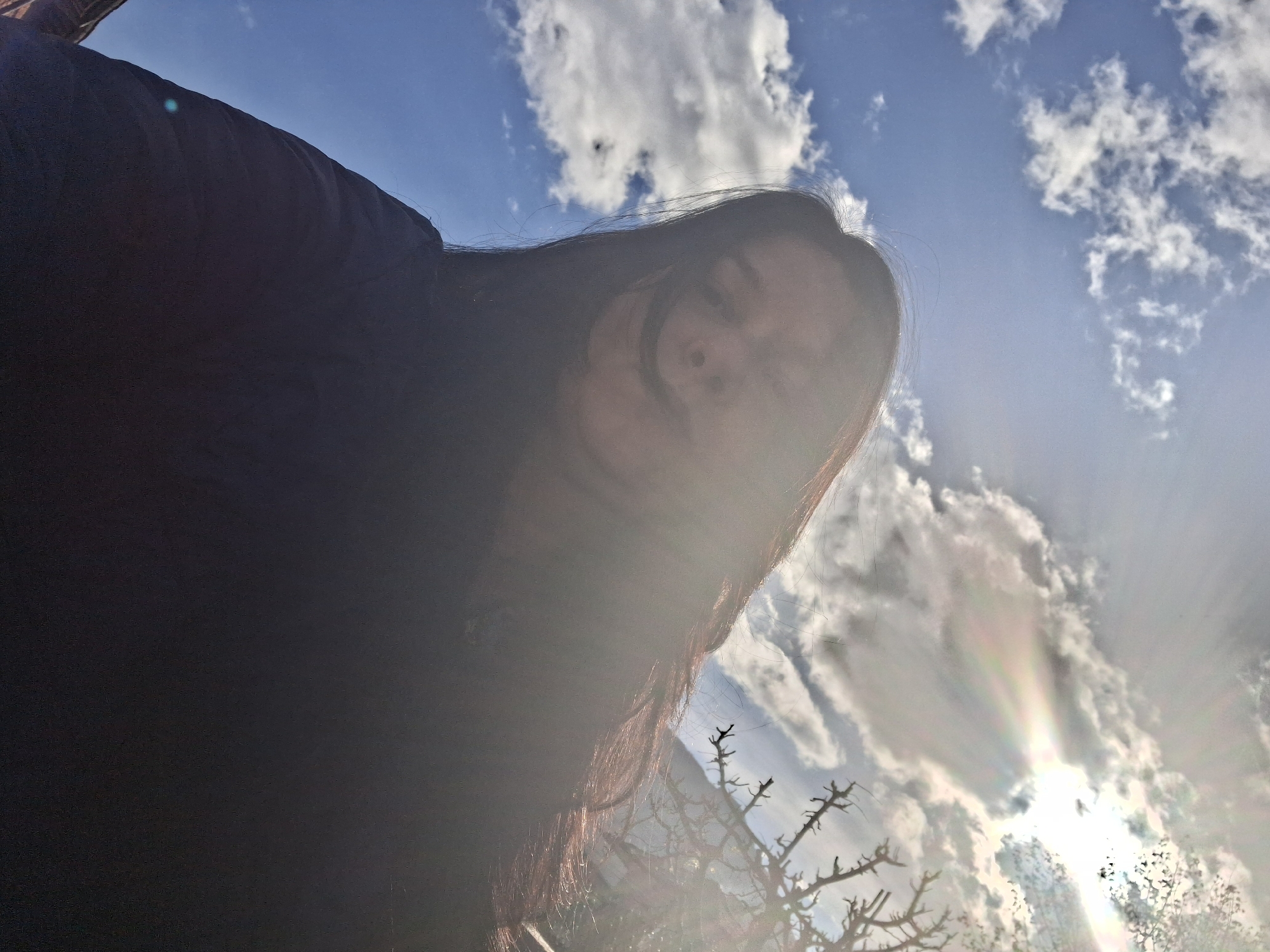 The image is taken from a low angle, looking up at a person against a sky with scattered clouds and bright sunlight. The person is partially obscured by the sunlight and the camera angle, but long, dark hair is visible. A dark garment covers the upper portion of the frame. At the bottom, bare tree branches are visible against the bright sky. The location is not discernible from the image. Therefore, I cannot confirm the location to be in Goce Delchev, Bulgaria.