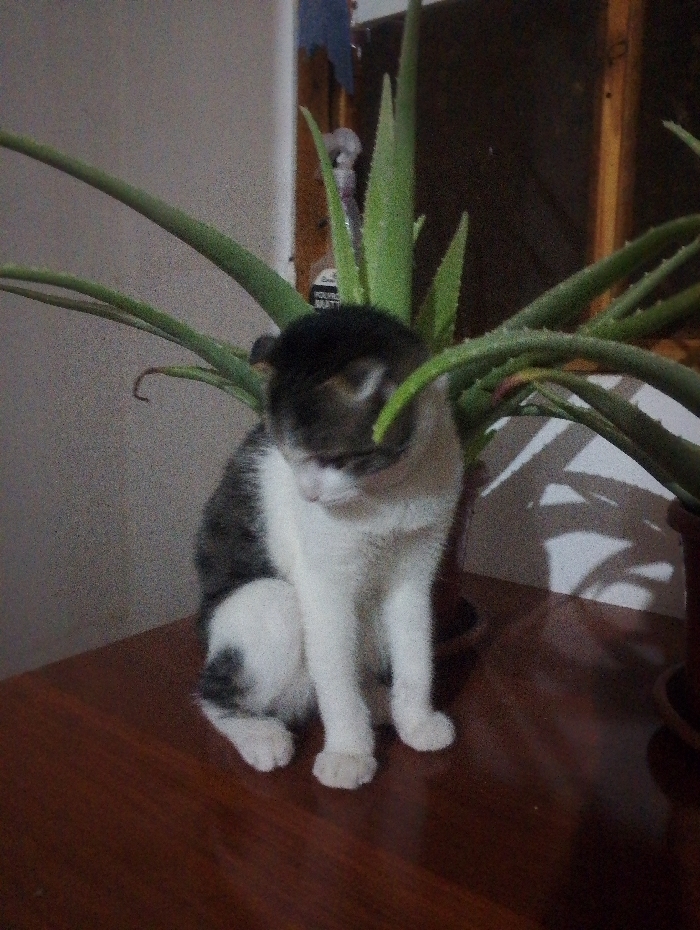 - "A white and dark gray cat sits among aloe vera plants on a polished wooden surface" by FM-W2D6p2, licensed under CC BY 4.0