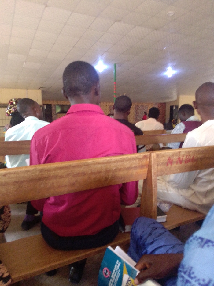The image depicts an indoor gathering within a building in Saminaka, Nigeria. The perspective is from behind the audience, looking towards the front of a hall or assembly area. In the foreground, a person is seated on a light brown wooden pew, facing away from the camera, wearing a bright pink long-sleeved shirt and dark trousers. To the immediate right, another individual, partially visible, is seated and holds an open booklet with a blue and white cover. Multiple rows of identical wooden pews extend into the midground, occupied by additional individuals also facing forward. From left to right, visible attendees include a person in a white long-sleeved shirt, another in a dark shirt directly behind the person in pink, a person in a white shirt further back, and an individual wearing a white garment with a reddish vest or pattern. The backrest of a midground pew displays the carved or written initials "NNBU". The ceiling above is constructed from light-colored square acoustic tiles in a grid pattern, illuminated by several bright, square-shaped artificial lights. A green vertical pole or column with red accents is visible in the background, with additional light sources nearby. The far background shows indistinct wall coverings or structural elements. All visible individuals appear to be adults.