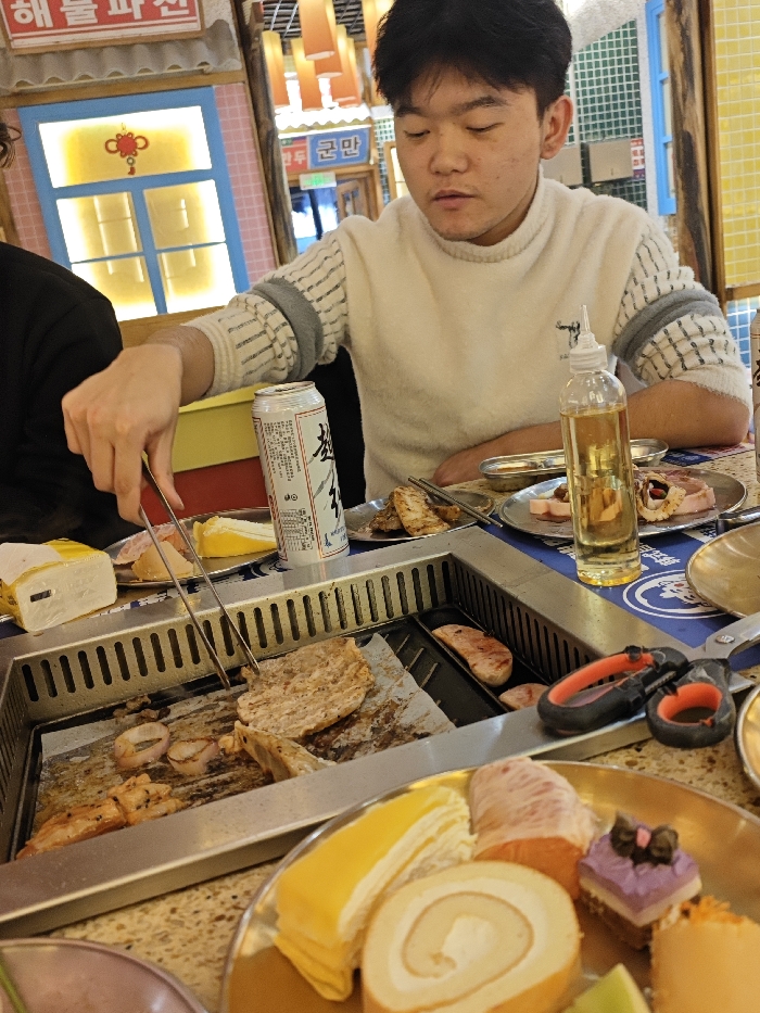 This image depicts an indoor dining scene within a Korean barbecue restaurant located in the Chongqing High-tech Zone, China. A young East Asian male, dressed in an off-white sweater with patterned grey sleeves, is seated at a speckled tabletop. He is actively cooking, holding metal tongs in his right hand to turn pieces of meat and sliced onions on a built-in stainless steel grill, which is lined with parchment paper. To his immediate left, a white aluminum beverage can displaying Korean script is present. Adjacent to the grill on the right, a clear plastic squeeze bottle filled with cooking oil, small metallic dishes containing various food items, and a pair of black and orange-handled scissors are arranged. The foreground features a metal plate presenting several small desserts, including yellow layered cakes, a spiral cake, and a miniature purple cake. A segment of another individual's arm, clothed in black, is visible on the far left. The background features decorative panels styled as colorful building facades with blue and yellow window frames and signs bearing Korean text, indicating dishes such as "Seafood Pancake."