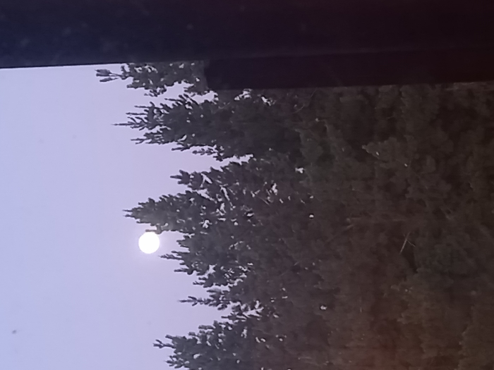 This image captures an outdoor twilight or pre-dawn scene in Santa Juana, Chile. A prominent, bright white, circular moon is visible in the upper-center against a light purplish-gray sky. Below the moon, a dense forest of dark green coniferous trees, likely pines, extends across the middle and lower portions of the frame, their tops silhouetted against the sky. A dark, vertical rectilinear object, consistent with a structural element or a large tree trunk, partially obstructs the view along the far right edge of the composition. No individuals or specific actions are depicted.
