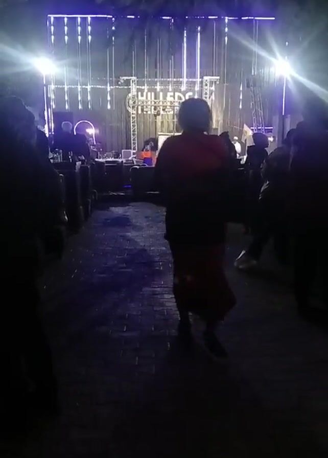 brick pathway leading to an outdoor stage at night, with silhouettes of people standing on either side