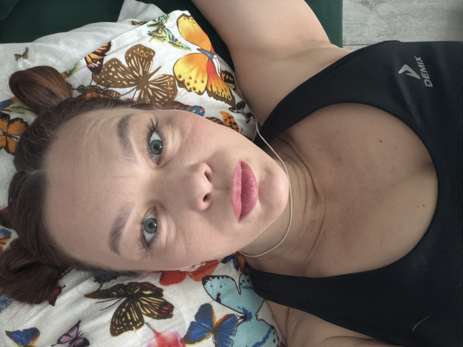 - "A woman with green eyes and pink lips lies on a butterfly-patterned pillow wearing a black tank top" by FM-Uq6Av1, licensed under CC BY 4.0