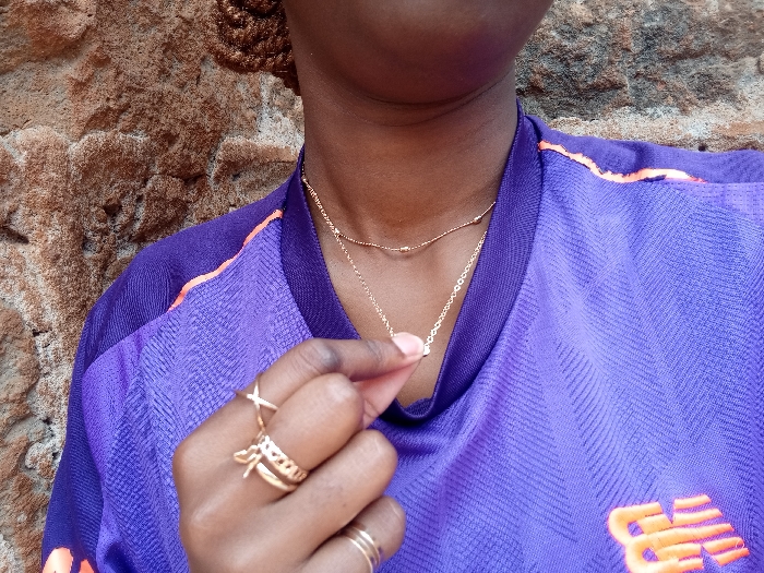 A close-up photograph captures the upper torso, neck, and right hand of an individual with dark skin, positioned against a rough, textured stone wall at an indeterminate outdoor or well-lit indoor location within Nyeri, Kenya. The individual is wearing a purple short-sleeved garment featuring a subtle diagonal patterned weave and an orange stripe or trim detail along the shoulder seam. A partial orange logo, resembling the stylized letters "NB", is visible on the lower right portion of the garment. Two gold-colored necklaces are worn: a shorter, beaded chain resting higher on the neck, and a longer, finer chain with a small, rectangular gold-colored pendant. The right hand, adorned with multiple gold-colored rings, is positioned centrally, with the thumb and forefinger gently holding the small rectangular pendant of the longer necklace. On the ring finger, three thin, plain gold-colored bands are stacked. On the middle finger, a wider, intricately patterned gold-colored band is visible, topped by a smaller, X-shaped gold-colored ring. The background is composed of irregular, reddish-brown and grey stones, consistent with a natural stone or rough-hewn wall structure.