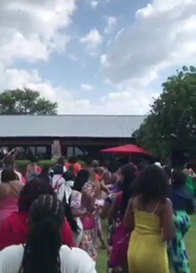 group of people dancing on a grassy lawn. They are mostly women, dressed in colorful clothing, and some are holding hands. Behind them is a single-story building with a gray roof and large windows, as well as a red umbrella. The sky is partly cloudy with blue sky visible.