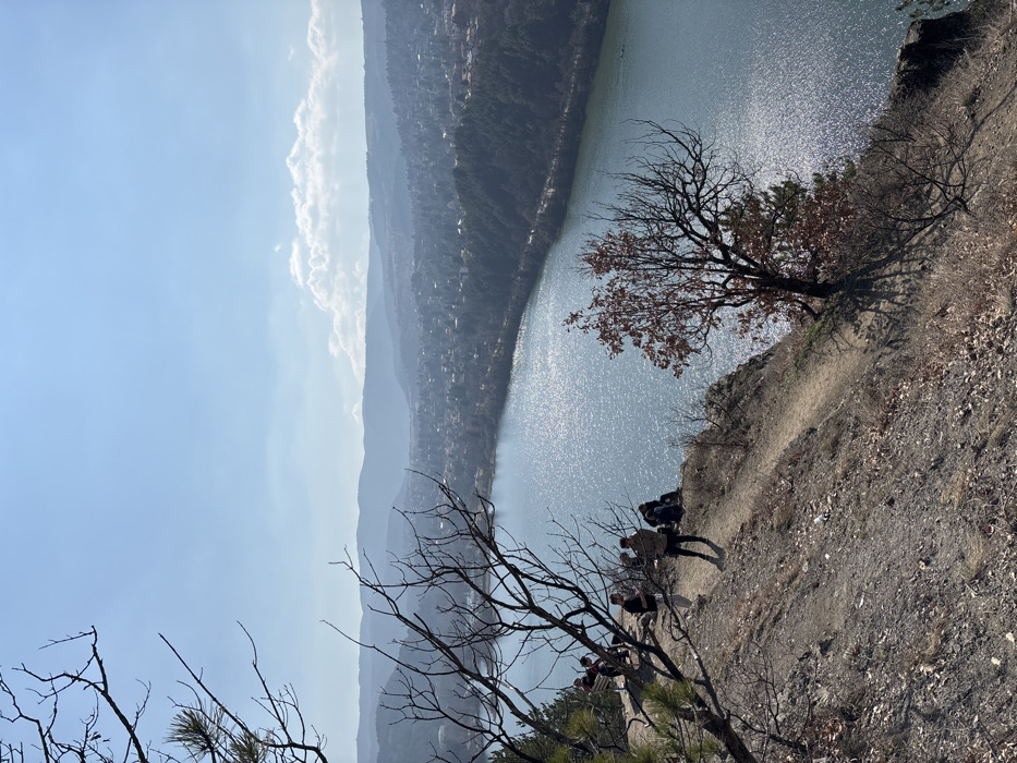 The image depicts a panoramic view from a hillside overlooking the Pancharevo Lake/Reservoir and the settlement of Pancharevo, Bulgaria, under a clear sky with scattered white clouds. In the foreground, a steep, dry dirt path meanders down the hillside. Bare branches of deciduous trees, along with some pine needles, partially frame the left side of the scene. Several individuals are present on the hillside path. To the far left, three individuals are positioned on a slightly elevated section, with two seated and one standing. Further along the path, two individuals stand conversing. Below them, a third group of two to three individuals is visible, with at least one seated near a backpack. The midground is dominated by the expansive, sun-dappled surface of the Pancharevo Lake/Reservoir, exhibiting significant glinting from sunlight. A narrow road or pathway runs parallel to the far bank of the water, bordered by dense evergreen tree coverage. Two small, dark objects resembling boats are visible on the water's surface towards the right. A prominent, mostly bare deciduous tree with some reddish-brown leaves stands on a rocky outcrop in the lower right midground. In the background, beyond the lake and forested hills, the sprawling town of Pancharevo is visible with numerous buildings and residential structures nestled within a valley. Further in the distance, successive layers of hazy hills and mountains recede towards the horizon. The sky is a bright, clear blue. The overall impression is an outdoor natural environment, likely during late winter or early spring, with multiple individuals engaging in leisure activities on a sunny day.
