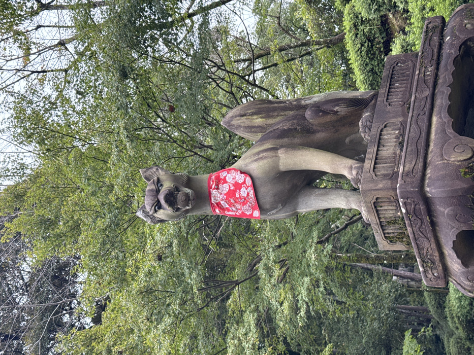 - "A weathered gray stone statue of a kitsune (mythical fox) stands prominently in a natural, forested setting" by FM-GMxhS2, licensed under CC BY 4.0