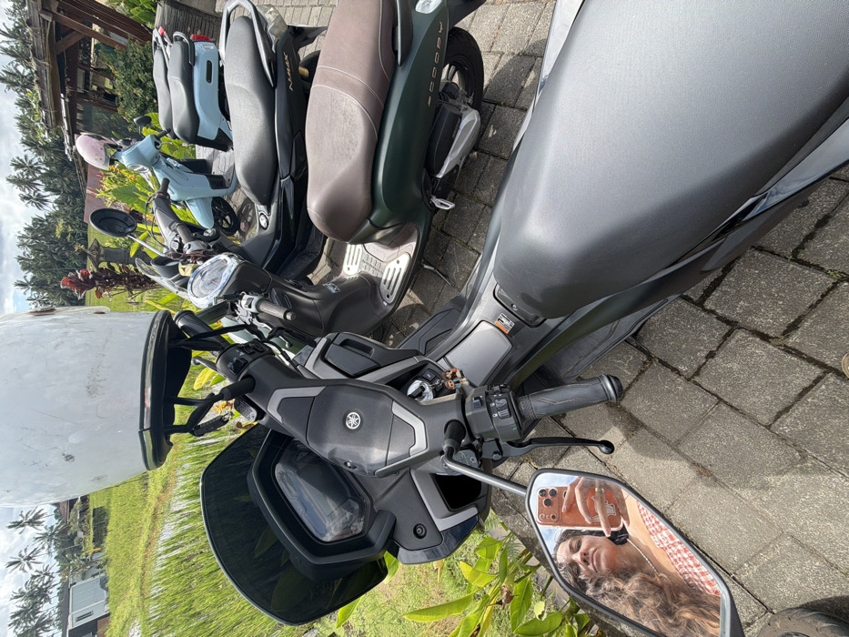 A lineup of parked scooters is shown on a paved surface next to a field. A dark gray scooter is closest, with the handlebars and side mirror visible. The mirror reflects a person holding a phone. Behind are other scooters in varying colors like brown, dark green, and blue. Some have helmets on the seats. Lush greenery is visible in the background.
