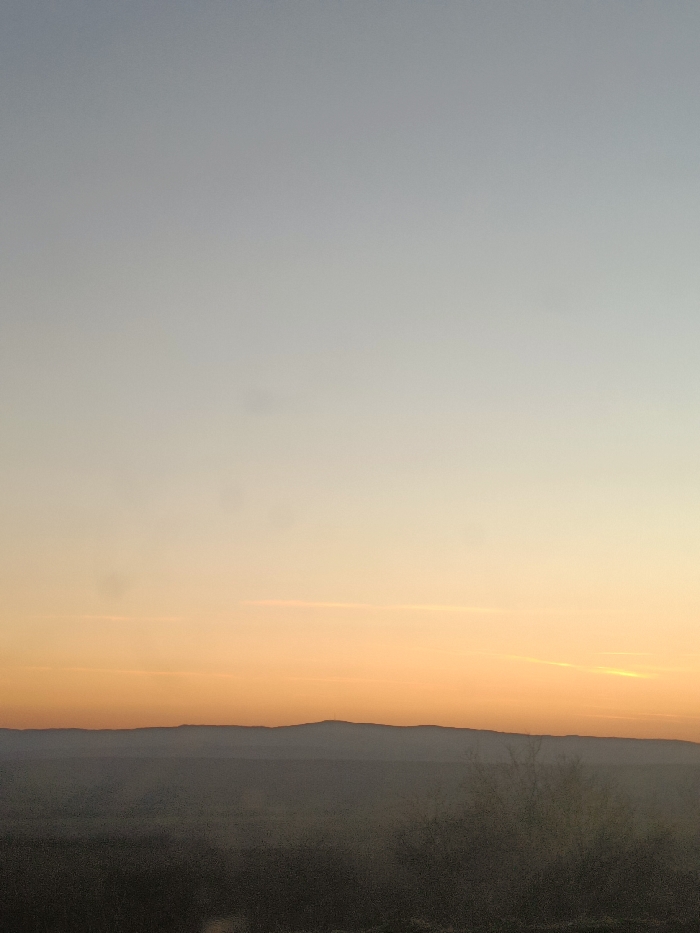 The image depicts a panoramic landscape view at either sunrise or sunset over the city of Byala, Bulgaria. The sky occupies the majority of the frame, exhibiting a clear gradient from light grey-blue at the top to vibrant orange-yellow at the horizon. Several faint, wispy horizontal cloud formations are visible within the orange-yellow band, particularly across the middle right. Multiple small, dark, irregular spots, consistent with dust on a camera lens or sensor, are present in the sky area. A dark, undulating mountain range forms a distinct silhouette against the illuminated horizon. Below this, the midground consists of a dark, indistinct expanse of terrain, likely obscured by distance or atmospheric haze. The immediate foreground is very dark, revealing only the faint outlines of sparse, low-lying shrubbery or bare trees, predominantly on the right side. No people, specific objects of human origin beyond the implied distant landscape, or explicit actions or interactions are visible. The environment appears natural and undeveloped in the visible distant and mid-ground.