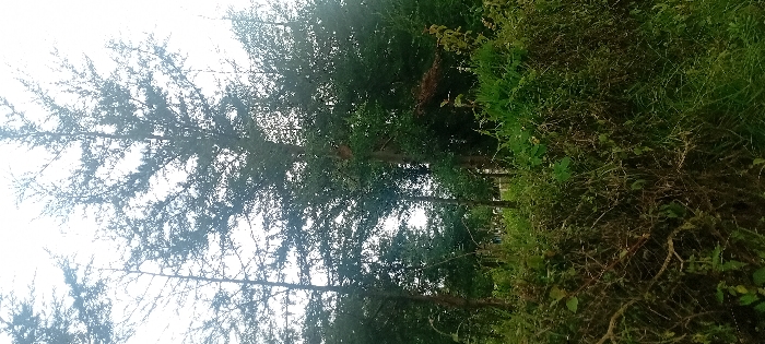The scene depicts an outdoor environment in Heni Village, Kenya, characterized by dense vegetation. In the background, multiple tall trees with dark green, coniferous-like foliage extend upwards against a bright, overcast white sky. The tree trunks are dark brown and relatively slender. The midground and foreground consist of thick, unmanaged undergrowth, composed of various shrubs, bushes, and tall grasses. This vegetation exhibits a mix of vibrant green and dried, brownish-gray elements, indicating a dense, wild growth pattern. No people, animals, or prominent man-made structures are discernible within the frame. The overall impression is that of a natural, possibly forested or overgrown rural area.