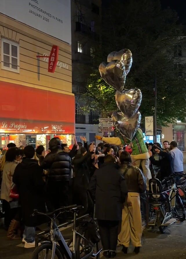 At night, a crowd of approximately 30 people is gathered on the street outside a building in Paris, France. The building has a red awning with “Le Progres Tabac” written on it and a sign saying “Tabac Regie.” A large advertisement above the awning says “Achol Photographed in Paris January 2026.” Some members of the crowd are waving their arms in the air, seemingly in celebration. In the center of the crowd, an individual holds up three silver heart-shaped balloons. Several bicycles are parked nearby.