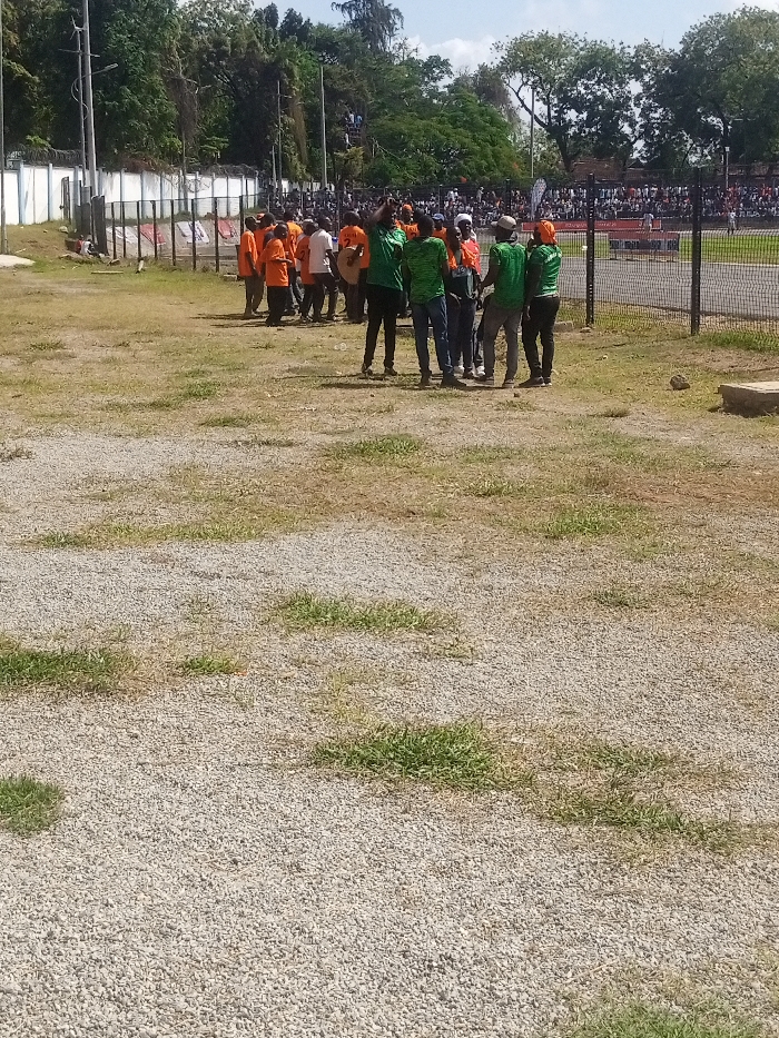 The image displays an outdoor scene at a sports complex, likely the Mombasa Sports Club in the Ganjoni/Shimanzi ward, Kenya. The foreground consists of light grey gravel ground with scattered patches of green and dried grass. In the midground, a group of approximately 15 to 20 individuals is assembled. The majority are dressed in bright orange short-sleeved shirts, while a smaller contingent of about five to seven individuals wears bright green short-sleeved shirts. One person in an orange shirt holds a circular percussion instrument, possibly a drum. The individuals are standing in a loose cluster, facing varying directions, indicating a gathering or interaction. To the left, a white concrete wall topped with barbed wire is visible, with utility poles and dense trees positioned behind it. To the right, a black metal mesh fence separates the gravel area from a track or field. Beyond this fence, stadium seating is visible, populated by a large crowd of spectators. Red elements, possibly banners or structural components, are present within the seating area. The background features a clear blue sky with scattered white clouds and additional dense tree cover.