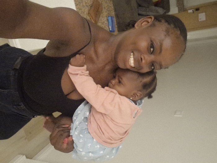 The image displays an indoor scene featuring an adult female holding an infant. **People:** The primary subject is a dark-skinned adult female, appearing to be in her 20s or 30s, with braided hair pulled back. She wears a black spaghetti-strap tank top and dark blue denim jeans. She is smiling broadly and looking directly at the camera, indicating a selfie. She holds a dark-skinned infant, likely under two years old, who appears to be asleep or resting deeply. The infant is clad in a long-sleeved pink top and a light blue dress with a white pattern. Small dark pigtails are visible on the infant's head, and a small earring is present in the left ear. The infant's head is resting on the adult female's left shoulder and upper chest, with its left arm draped across her. **Actions/Interactions:** The adult female is actively holding the infant in her left arm, supporting its body. Her right arm is extended, suggesting she is holding the camera to take the photograph. The interaction is one of a caretaker holding a sleeping child. **Environment/Objects:** The background is an indoor setting with plain, light-colored walls. To the left of the adult female, a light-colored wooden door with a white rectangular note or sign attached to it is partially visible. Below the door, a dark-colored piece of furniture, possibly a sofa or chair, is indistinctly seen. To the right, behind the infant, a white rectangular wall plate (likely an electrical outlet or switch cover) is visible on the plain wall. A light-colored floor, possibly wood or tile, is visible at the bottom right. On the left side of the image, below the adult's arm, a light-colored surface (possibly a countertop or table) is partially visible, holding a small brown object and a blue rectangular container. **Location:** The specific location within the city of Itirin, Nigeria, cannot be determined from the visual content of the image. The scene depicts a generic domestic or private indoor environment.