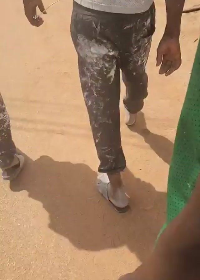 A low-angle shot shows two people walking on a sandy surface. The person on the left wears paint-splattered dark pants, a white tank top, and sandals. The person on the right wears a green mesh tank top and tan pants, and seems to be filming the person on the left. Their shadow is visible on the ground. A yellow vehicle is partly visible on the right in the background. The first person is covered in white paint on their clothing.