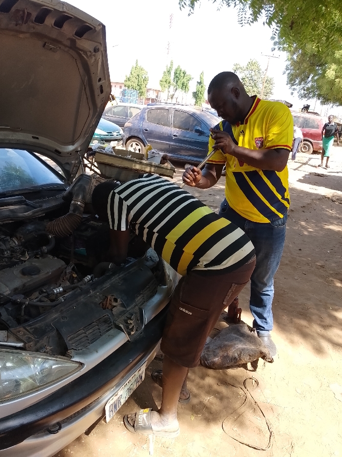 The image depicts an outdoor automotive repair scene in Yelwa, Nigeria, under bright daylight