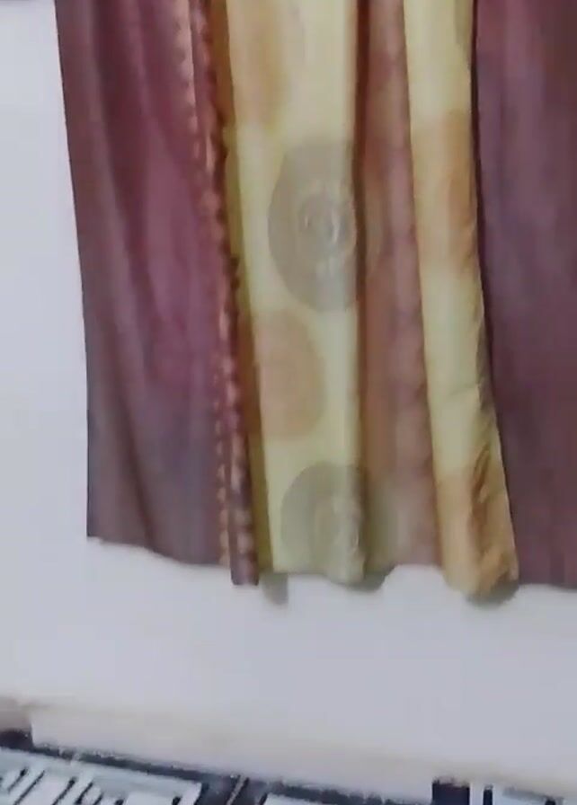 portion of a room. The lower part of the frame shows a bed covered with a white blanket, resting on a tile floor with a black and white geometric pattern. The background features a wall with curtains. The curtains consist of a burgundy fabric with a zig-zag patterned edge, and an adjacent panel of a lighter cream color with circular patterns. The camera pans upwards, revealing the curtain rod attached to the wall. A door frame is visible in the upper right corner of the frame.