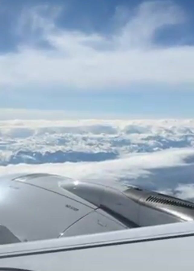The view from an airplane window shows the wing of the plane in the foreground, with fluffy white clouds stretching to the horizon against a blue sky