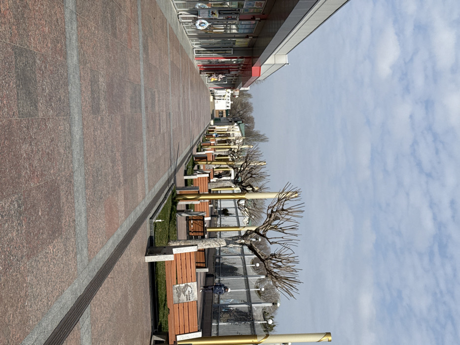The image depicts a pedestrian promenade in Anapa, Russia, viewed from a low angle looking into the distance. The paved walkway, composed of reddish-brown and grey granite-like tiles, stretches centrally through the frame. A dark, ribbed tactile paving strip runs along the right edge of the walkway. On the left, a row of low-rise commercial buildings with modern facades, featuring glass storefronts, red accents, and grey upper sections, lines the promenade. Storefronts display various items, including some white circular objects. On the right, a landscaped strip features regularly spaced, pollarded deciduous trees with bare branches and white-painted trunks. Between the trees are brown wooden benches with concrete bases, each positioned in front of a tall, golden-colored cylindrical pillar, possibly a decorative lamppost. Behind this row of trees and benches, a grey metal fence with ornamental elements encloses another area, beyond which more trees and indistinct structures are visible. A single individual, dressed in dark clothing and a light-colored hat, is visible on the right side of the promenade, walking away from the viewer near the benches and fence. Other faint figures are discernible further down the promenade but are not clearly identifiable. The sky is bright with scattered cumulus clouds, indicating daytime conditions. Sunlight casts subtle shadows to the left, suggesting the sun is positioned to the right of the frame. The scene appears uncrowded.