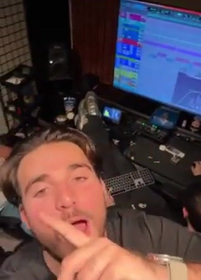 A man with dark hair and a light beard, wearing a black shirt and a watch, is recording a selfie video in what appears to be a music studio