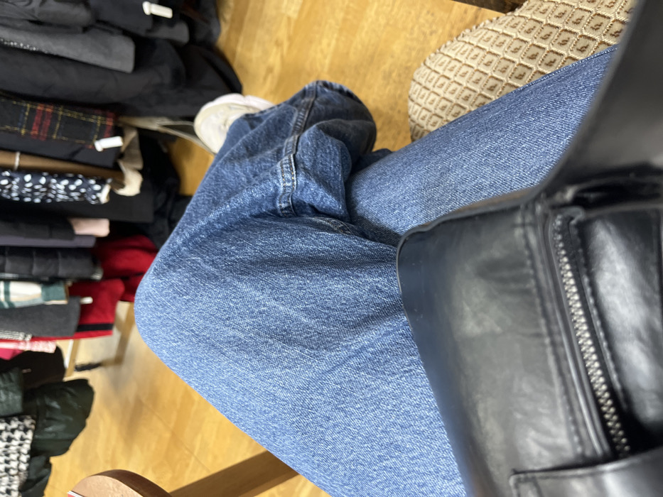 The image presents a first-person, downward view of an individual seated in an indoor retail environment in Vendenheim, France. The subject's legs, clad in blue denim jeans, occupy the central foreground. A black bag or object with a prominent silver zipper is positioned across the lap area. The right foot, wearing a light-colored athletic shoe, is partially visible. The immediate surroundings include a portion of a patterned, beige-colored chair cushion on the lower right and a light wooden surface on the far left. The background consists of a light wooden floor and multiple clothing racks displaying various garments, including dark coats, a white and black patterned item, a red item, a plaid scarf, and a polka-dotted item. Several garments exhibit white identification tags.