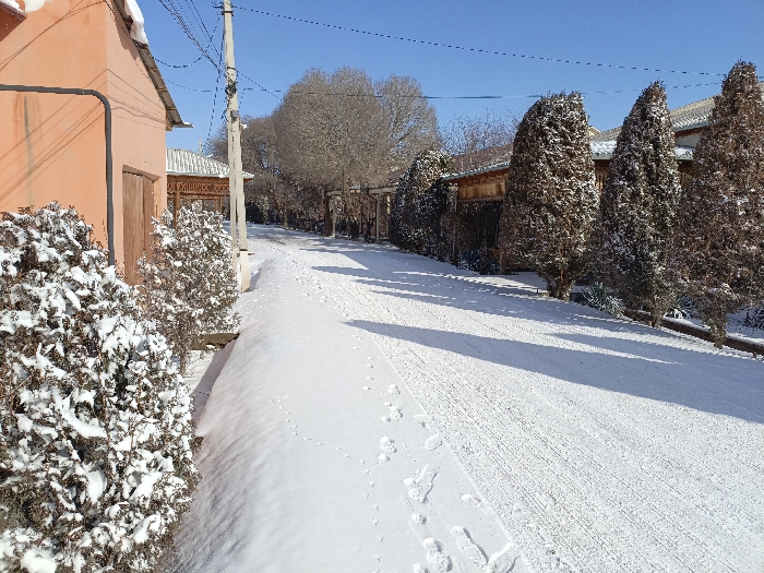 A snowy street scene under a clear blue sky. Snow covers the road, side bushes, and tree branches. On the left stands a peach-colored building with snow-covered bushes in front. Along the right, tall, evergreen trees line a property. Shadows stretch across the snow-covered road, creating contrast. Power lines cross overhead. A few footprints dot the snow's surface.