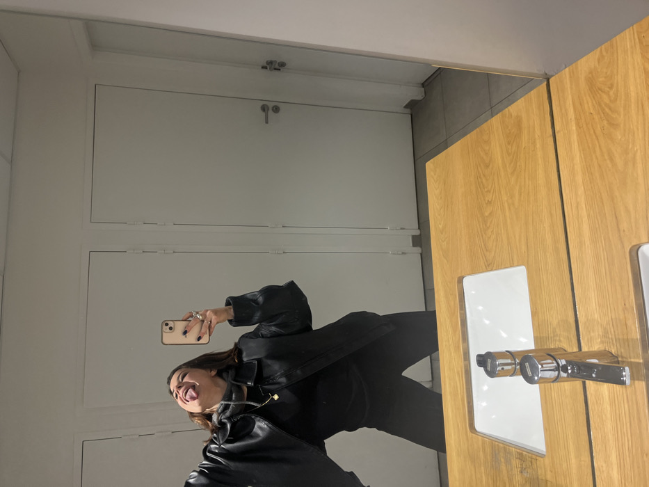 The image captures a mirror selfie taken by a female subject in a public restroom in Lille, France. The subject, positioned centrally in the reflection, has dark brown hair and is wearing a black faux leather jacket over a dark hooded top and black pants. A gold-colored pendant necklace is visible. Her left hand holds a light-colored smartphone, used to capture the image, with dark nail polish and several rings evident on her fingers. She is seen sticking her tongue out with her head tilted back and to her left. The immediate foreground features a light wooden countertop with an integrated white rectangular sink, a chrome faucet, and a matching chrome soap dispenser. The background, reflected in the mirror, consists of light-colored walls, displaying three vertical door-like panels, with a silver-colored door handle visible on the rightmost panel. The floor is covered in light grey tiles.