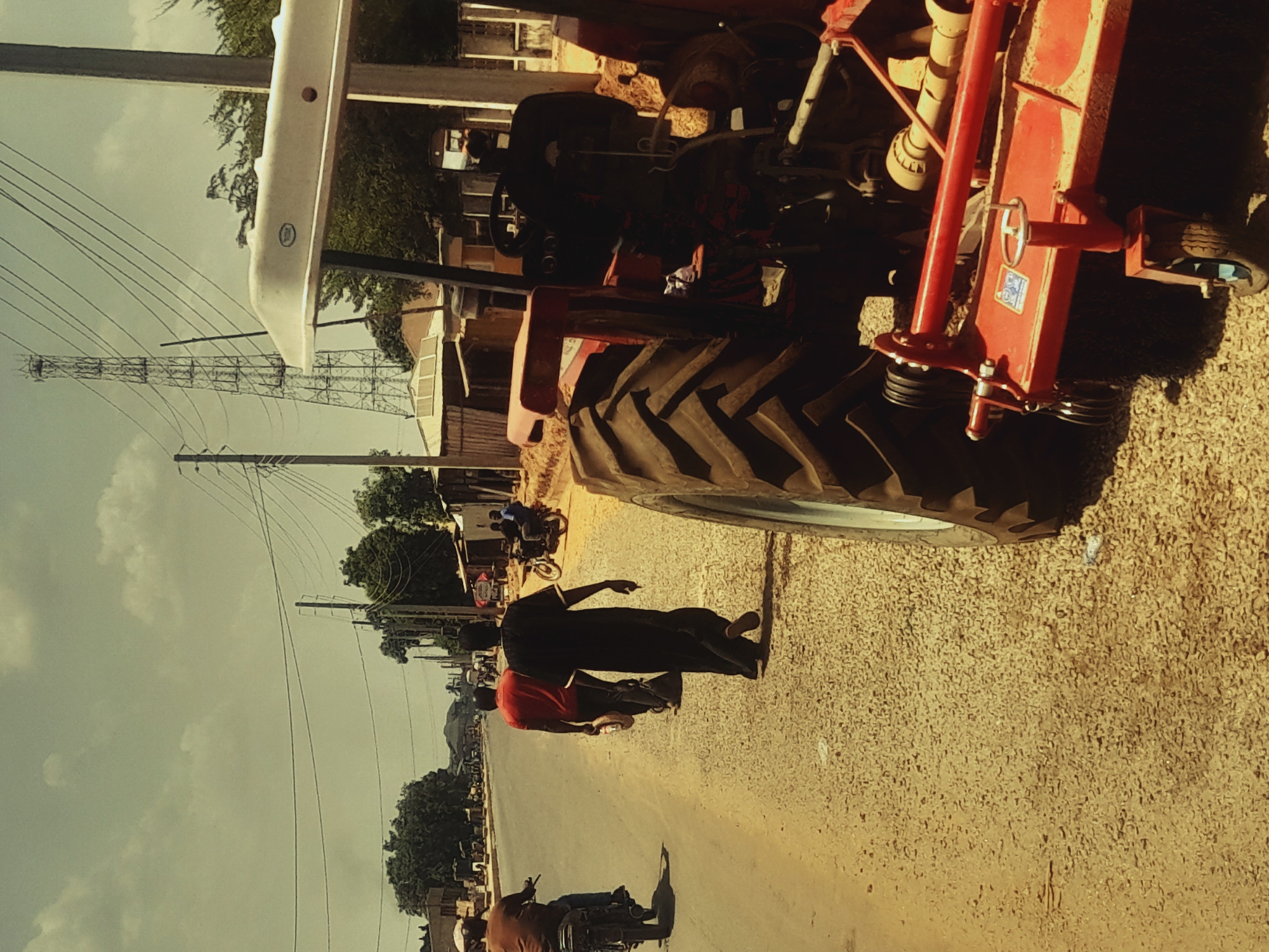The image depicts a daytime scene on an unpaved road and shoulder in Ube, Nigeria. In the immediate foreground on the right, a red agricultural tractor is parked, its large black rear tire and a red farm implement with a small wheel clearly visible. A white canopy covers the tractor's driver area. The road to the left of the tractor is composed of packed dirt and gravel. Midground elements include four male individuals moving away from the viewer. Three men are walking along the gravel shoulder: one in black attire carrying an object, followed by another in a red shirt carrying a lighter object, and a third further ahead in an orange-brown shirt. To their left, on a paved section of the road, a person wearing a light-colored helmet and brown shirt is operating a motorcycle, also moving away from the camera. In the distance, additional vehicles and figures are discernible on the road. The background features a row of single-story buildings with various roofs, including corrugated metal, lining the road. Utility poles with multiple power lines run overhead. A prominent, tall, metal lattice communication tower is visible on the right side of the road, behind the tractor's position. Green trees are interspersed throughout the scene. The sky is partly cloudy or hazy. The overall lighting suggests bright daylight, and the image has a warm, somewhat desaturated color cast.