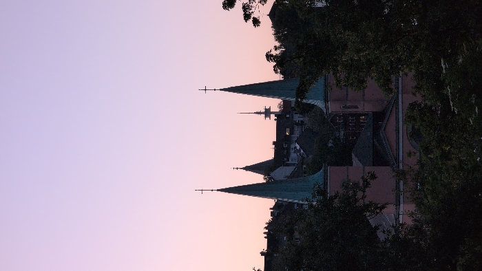 view of two church spires, one taller than the other, in the city of Wuppertal, Germany. The location, based on the provided coordinates, is near the intersection of Barmen and Elberfeld, two districts of the city. The spires are partially obscured by a thick stand of trees, with only the top half visible. The sky is a pale purple color, suggesting a time shortly after sunset. In the distance, behind the church spires, a communications tower is visible against the sky. The foreground is filled with dark foliage. The rooftops of nearby buildings, including an apartment complex, are visible behind the trees in the middle ground. The scene appears peaceful and serene.