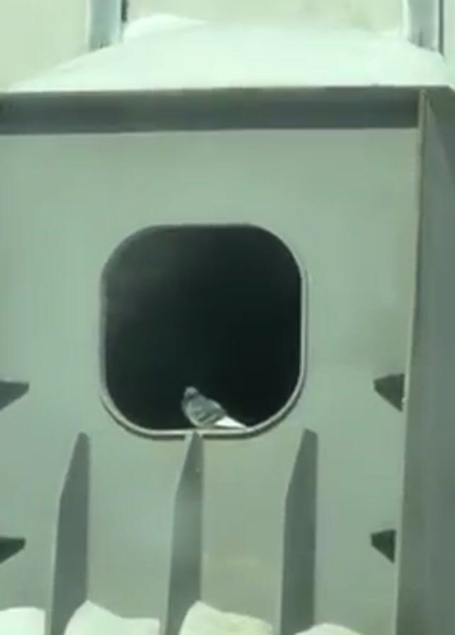 pigeon perched in a small opening in a metal structure. The structure has a square face with a rounded hole in the center, where the pigeon is sitting. The structure appears to be part of a larger industrial or transportation complex. Some snow is visible on top of the structure. The video is taken from inside a vehicle.