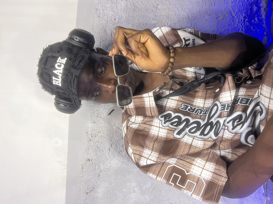 A young male subject with dark skin is depicted in Bar Gada, Nigeria, posing against a two-tone textured wall. He wears a distressed black baseball cap with "BLACK" embroidered in white, topped with black over-ear headphones. His attire includes a brown and white plaid short-sleeved shirt featuring large white and grey stylized text, notably "Los Angeles" and "Culture" or similar words. A black strap, likely from a bag or accessory, crosses his chest. On his right wrist is a wooden beaded bracelet. He holds silver-framed rectangular sunglasses with his right hand, positioned to partially obscure his eyes, while looking downwards and slightly right. The background wall consists of an off-white upper section and a light grey lower section, displaying visible texture and wear, with a faint blue light emanating from the bottom right corner.
