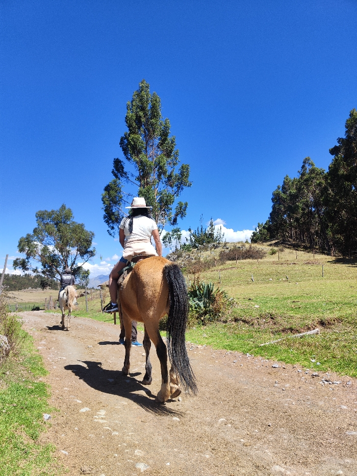 - "The image depicts two individuals horseback riding on a sunlit, unpaved dirt path in a rural area bordering Cuzco, Peru" by FM-20kwN2, licensed under CC BY 4.0