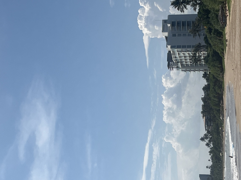 The image displays a daytime coastal scene in Peleana, Sri Lanka. The upper two-thirds of the frame show a light blue sky with scattered white cumulus clouds, which are notably denser and larger towards the right horizon. The lower third features a sandy beach bordering an ocean with small breaking waves. At least two individuals are visible in the shallow water near the shore; one appears to be holding a small board. The coastline is backed by a dense band of tropical vegetation, including numerous palm trees and other green foliage. Along this vegetated edge, several smaller, shaded structures, consistent with beach huts or seating areas, are discernible. A prominent multi-story building, white with modern architectural elements and multiple balconies, occupies the mid-right portion of the image, situated amidst the trees and set back from the beach. Scaffolding is visible on the upper-left facade of this building. Further to the left and in the distance, another multi-story structure is partially visible through the vegetation. On the sandy foreground, towards the bottom-right, a wooden structure, possibly a small boat on a trailer or a stationary fishing apparatus, rests on the sand.