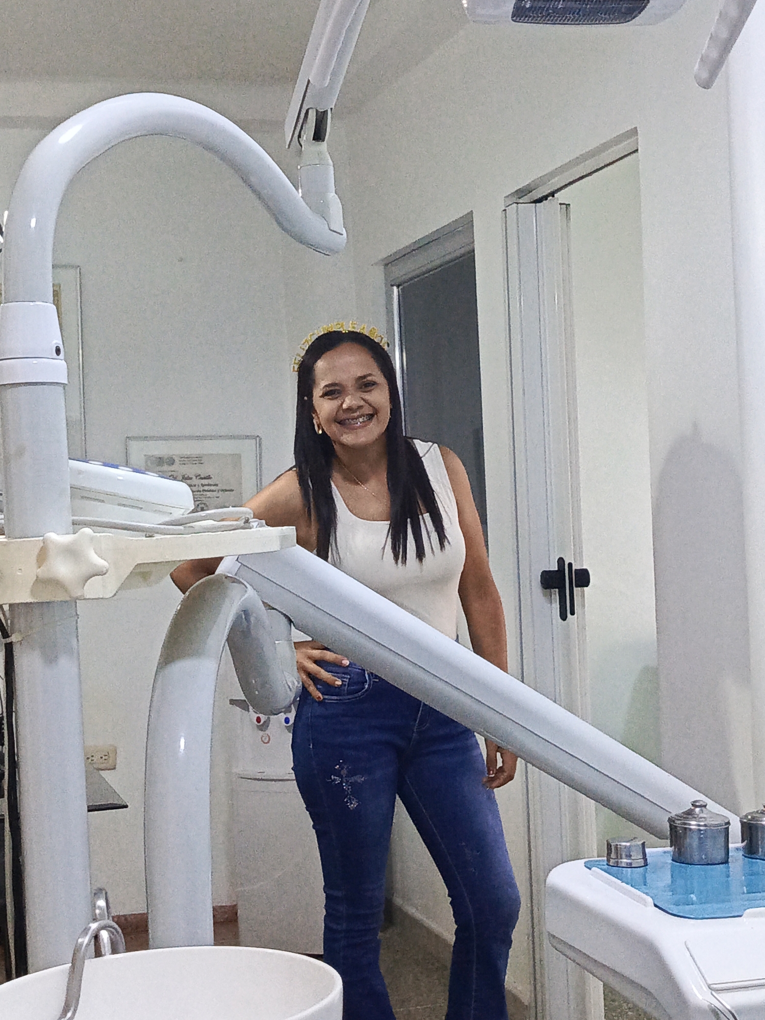 The image depicts a woman with dark hair, wearing a white top, jeans, and a gold-colored crown, standing in what appears to be a dental office. She is smiling and has braces. The office is equipped with standard dental equipment, including a dental chair, lighting, and various tools and instruments. A doorway is visible in the background. The location is Tinaquillo, Venezuela.