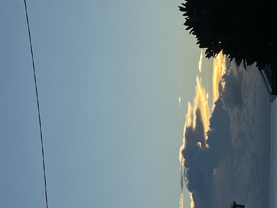 The image depicts a coastal sunrise or sunset scene in Coalcliff, Australia. The upper sky is a clear light blue, with a thin, dark horizontal utility wire spanning across it. Below, a large, dark, multi-layered cloud formation dominates the mid-ground, with its upper and right-side edges illuminated by golden and white sunlight, indicating a low sun behind the clouds. To the right, the silhouette of dense foliage from a tree or large bush partially obscures the glowing clouds. In the bottom-left corner, a small section of a light-colored roof structure is visible. The lower portion of the image shows a calm body of water, consistent with the Pacific Ocean, with a faint, dark horizontal line on the distant horizon, potentially indicating land or an island. No individuals or discernible actions are present.