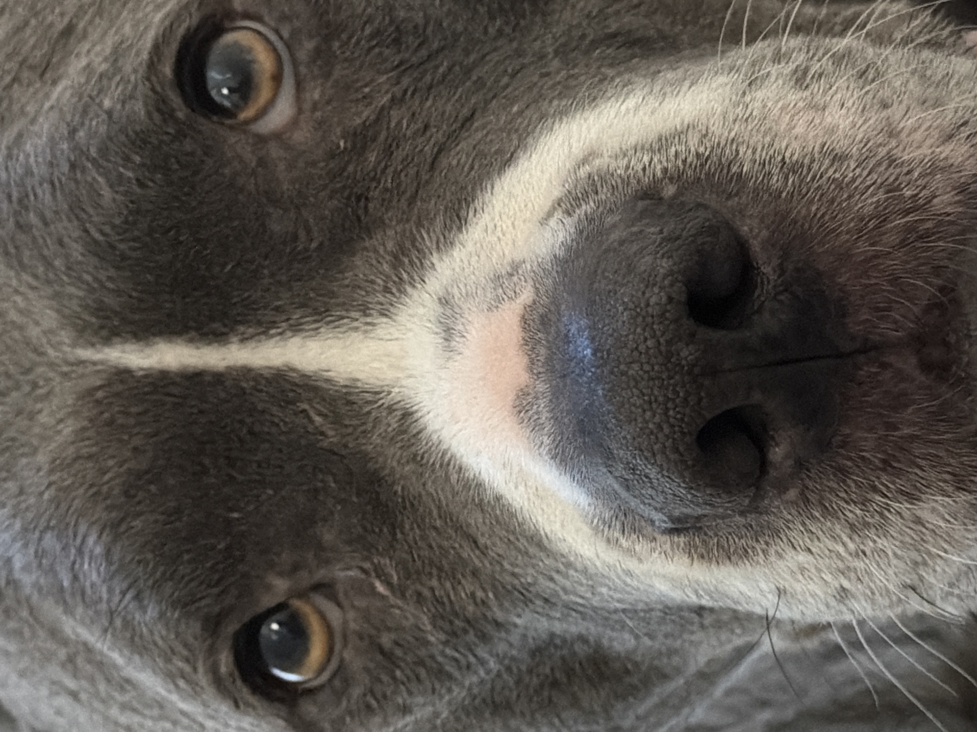 A close-up, rotated image of a gray and white dog's face. The dog's nose is large and black with two nostrils, positioned centrally in the frame. Above the nose, a white stripe extends upwards between the dog's eyes, which are visible at the top left and bottom right corners of the image. The dog's fur is short and dense. The location is unknown.
