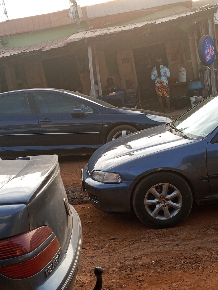 Three parked cars fill the frame, each a different shade of blue. A dark Peugeot 406 is on the left, next to a gray Honda Civic. A dark blue Peugeot is partially seen in the background. Behind the cars is a building with a green roof and open front, where two people are seen. A "Life" sign hangs on the building's side. The ground is reddish-brown dirt.