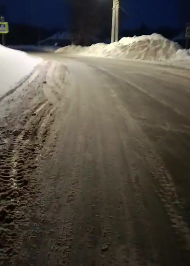 road covered in snow at night. A streetlight illuminates the scene, creating a bright spot in the distance. A snowbank is visible on the right side of the road, and tire tracks are visible on the road surface. The overall atmosphere is dark and cold.