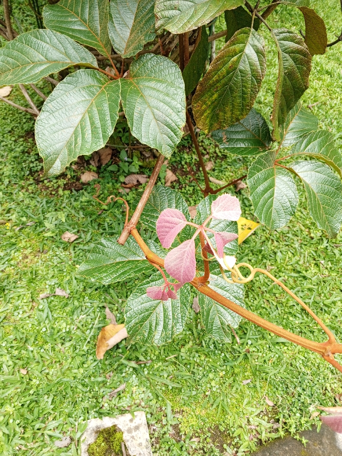 A plant with large, ovate green leaves featuring prominent veins dominates the scene. Some leaves show brown patches. A vine-like stem extends across the image, displaying small, pinkish-red leaves near the top. A tendril coils around the stem. The plant is surrounded by green grass, and a small concrete block with moss grows in the lower left corner.