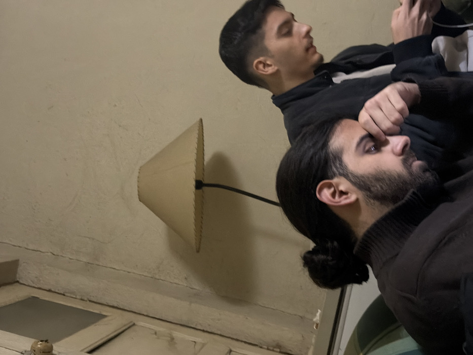 Two men sit in a room with an off-white wall. One man, with short dark hair, is using a phone, and his hand is resting on the forehead of the man below. The man below has long dark hair pulled into a bun, and a beard. A wall-mounted lampshade is on the left, with a cord leading towards the men. A portion of a window frame is visible at the bottom left.