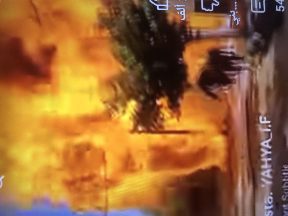 A blurred image shows what appears to be a street scene with intense orange and yellow flames engulfing buildings. Trees are silhouetted against the fiery background. The image seems to be captured from a screen displaying a video, possibly of a news report or dramatic content, as Arabic text and other video control elements are visible at the top. The overall impression is one of destruction and chaos.