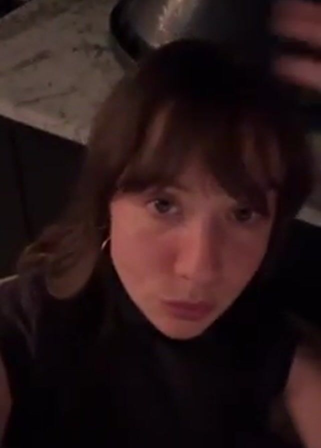 A woman with brown hair and bangs is shown in a close-up selfie video