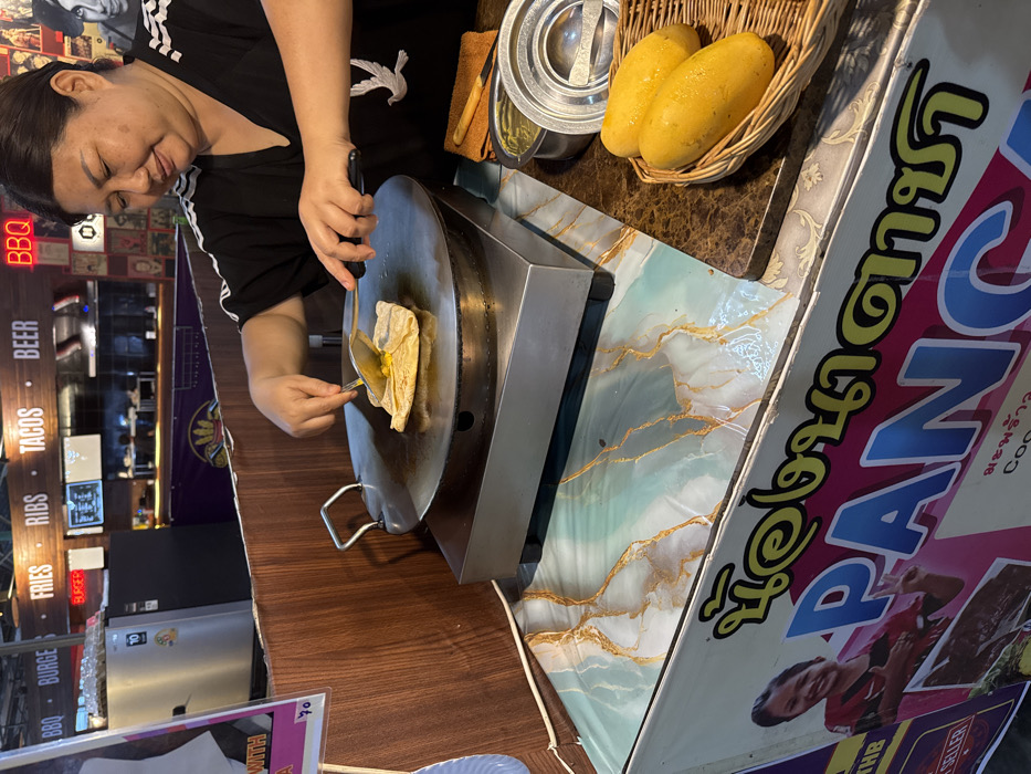 An adult female, likely of Thai ethnicity, is depicted from the chest up, actively preparing food at a market stall in Moo 1, Thailand. She wears a black short-sleeved t-shirt with a white bird graphic on the right sleeve and has dark hair pulled back. Her attention is focused on a large, round, flat-top griddle, where she is cooking a square-folded, golden-brown pastry, utilizing a yellow spatula in her left hand and a dark-handled spatula in her right. The griddle rests on a stainless steel base unit. The stall's counter features a light blue and gold marbled surface on the left and a dark brown mottled surface on the right. Two ripe yellow mangoes are placed in a small woven wicker basket on the right counter, alongside stainless steel bowls and a container with a yellow-green substance. The front of the counter displays a colorful banner featuring Thai script, the letters "PANC", and an image of a smiling woman. The background indicates a food court or night market environment with wooden paneling and overhead signs for "BBQ", "BURGER", "FRIES", "RIBS", "TACOS", and "BEER". A red neon "BBQ" sign is visible, as is a silver refrigerator on the far left. Distant stalls with purple accents and wall posters are visible further in the background.